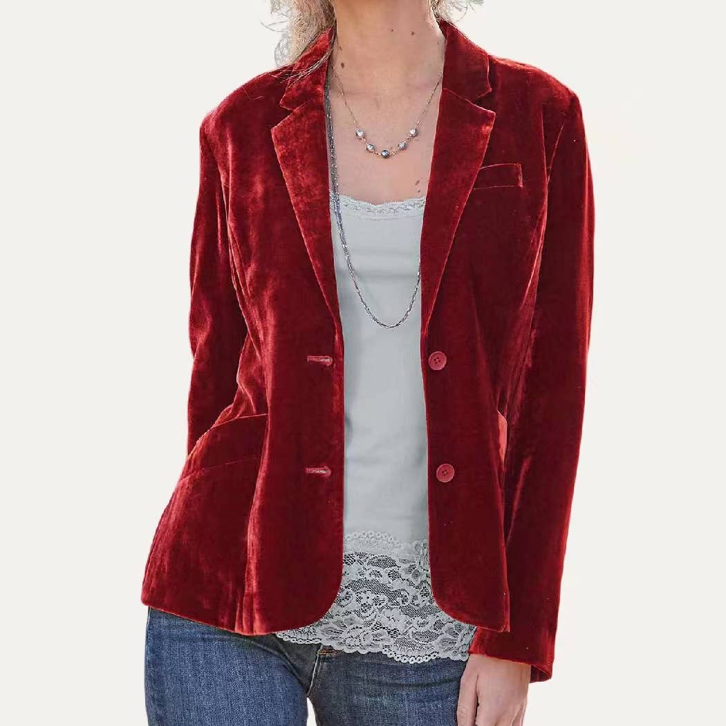 *FEATURES: Lightweight Velvet/Thin/Soft/Collared Neck/Buttons Down/No paddinging shoulders/Long Sleeve/Two Pockets/Waist Length/Fitted Bodice