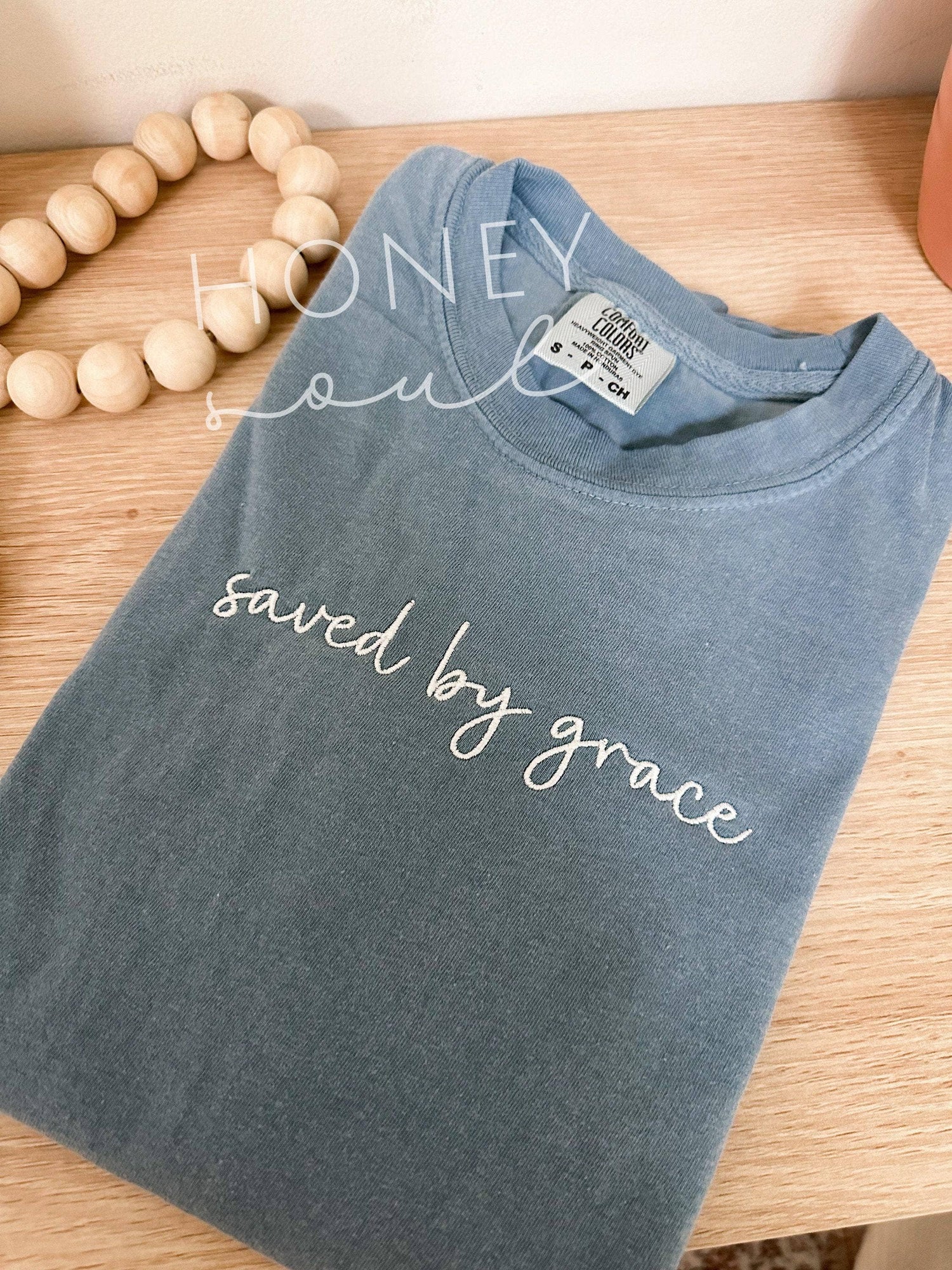 christian tops birthday gift Christian faith apparel Embroidered Trendy Tops In style saved by grace embroidered top gift mode gift under 25 gift for friend Christian apparel