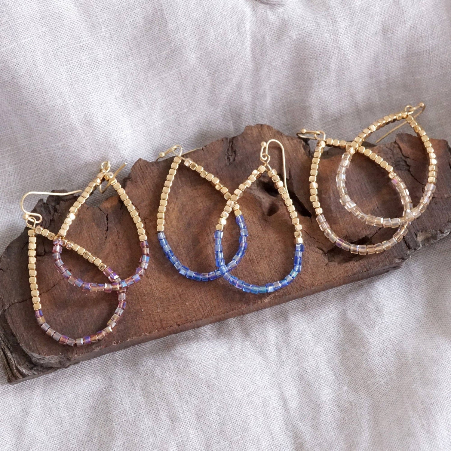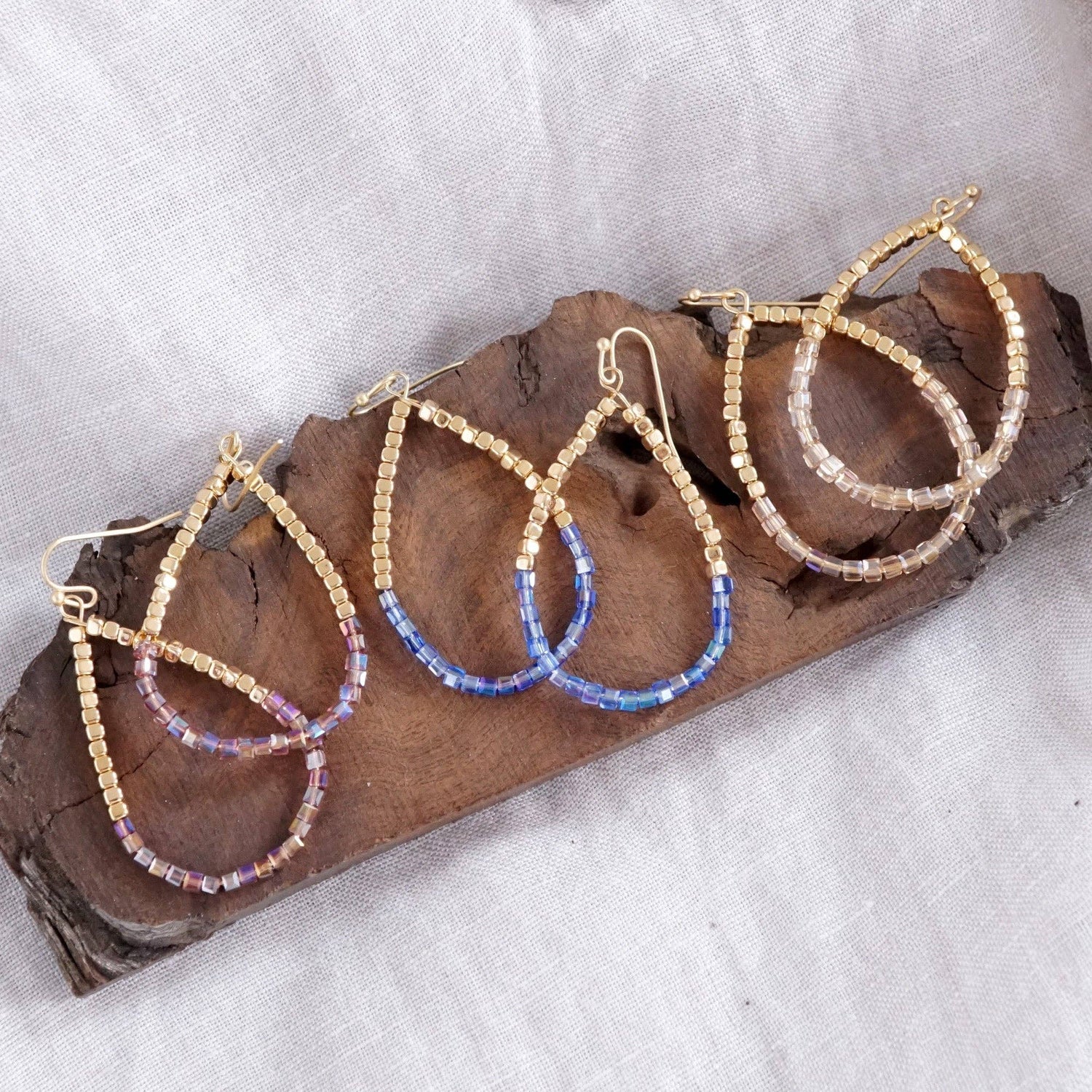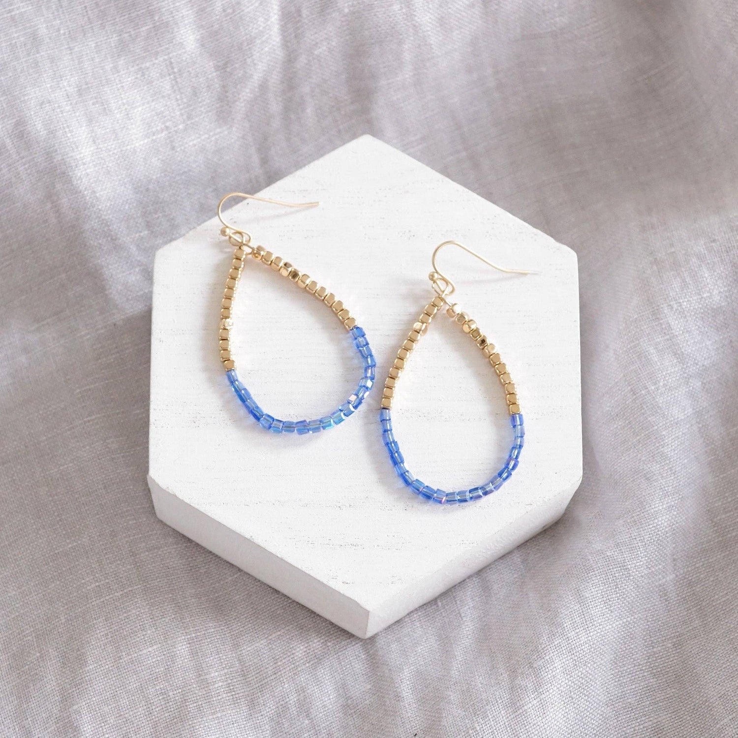 A graceful blend of shimmer and color, these teardrop earrings feature faceted glass beads and golden accents, creating an effortlessly elegant statement. Lightweight and versatile, they add a refined touch to any outfit.
