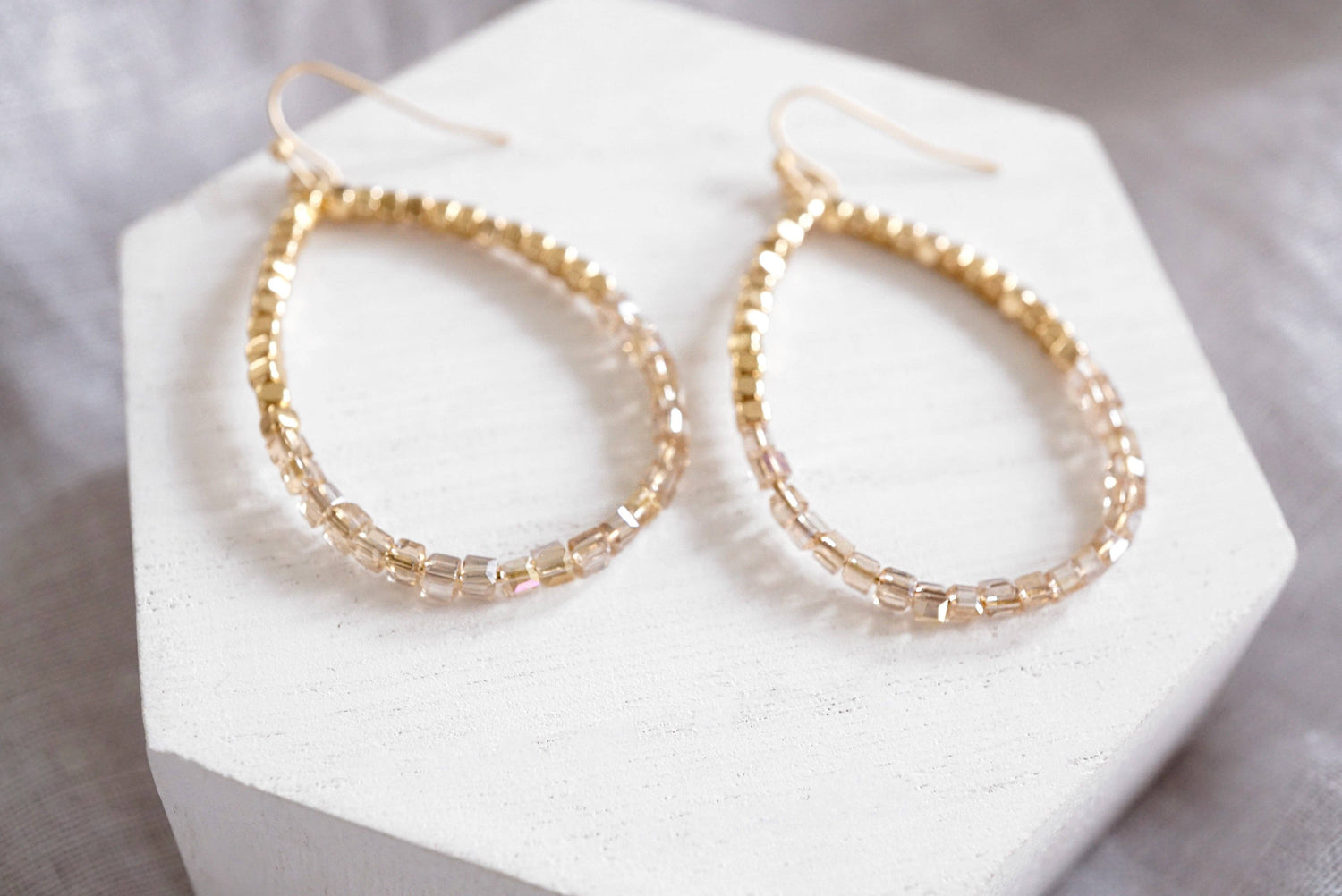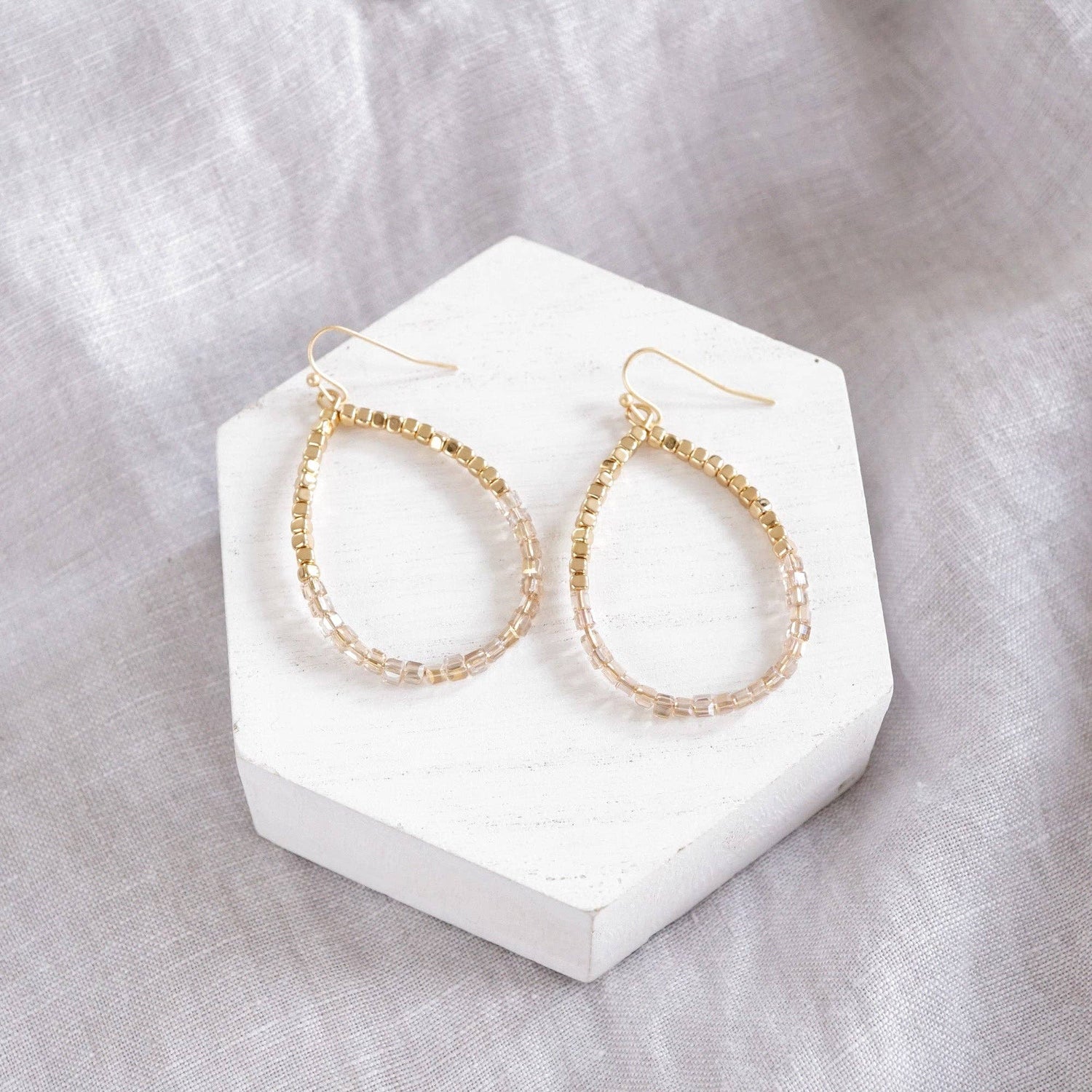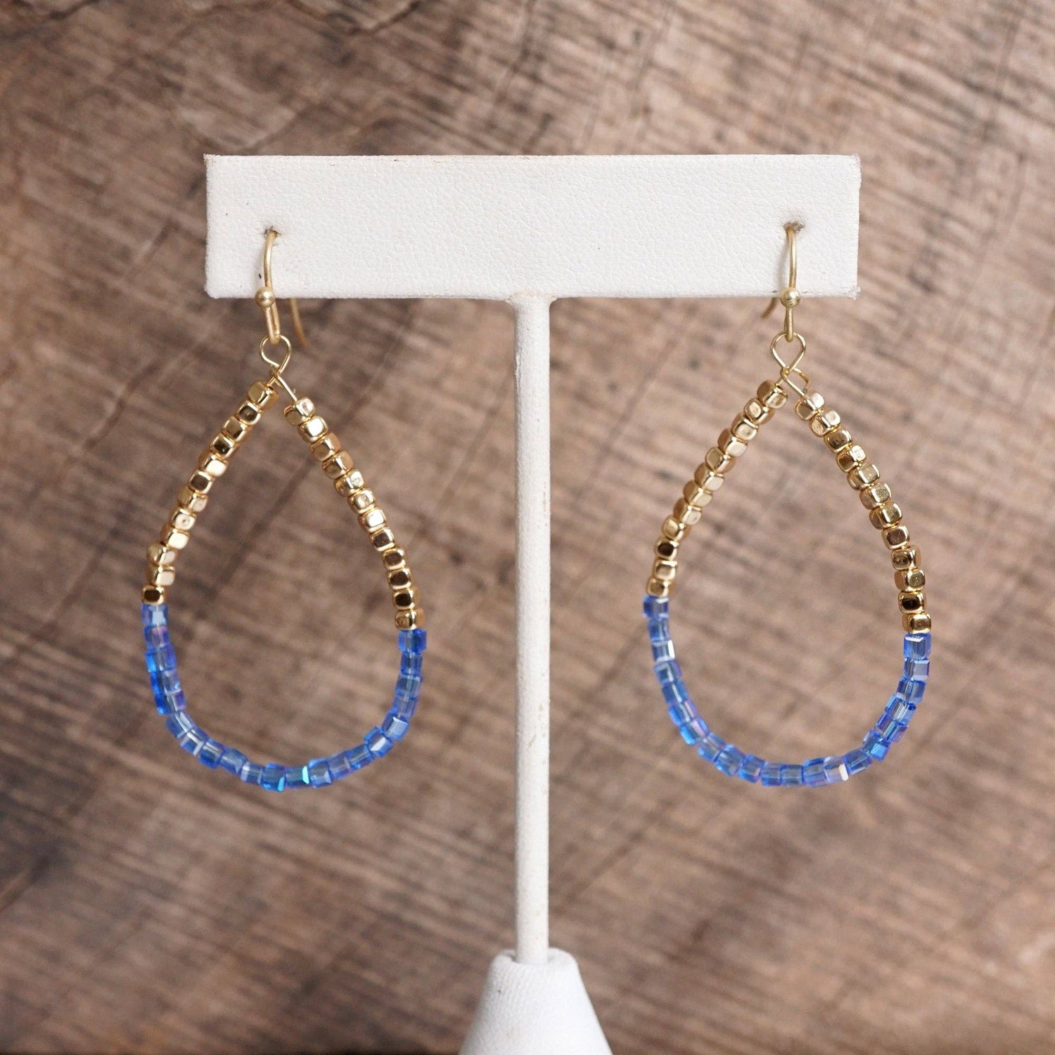 A graceful blend of shimmer and color, these teardrop earrings feature faceted glass beads and golden accents, creating an effortlessly elegant statement. Lightweight and versatile, they add a refined touch to any outfit.