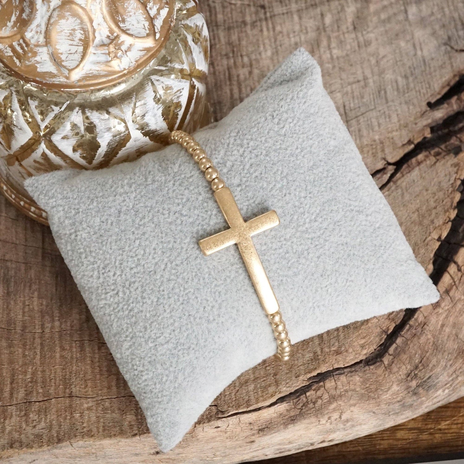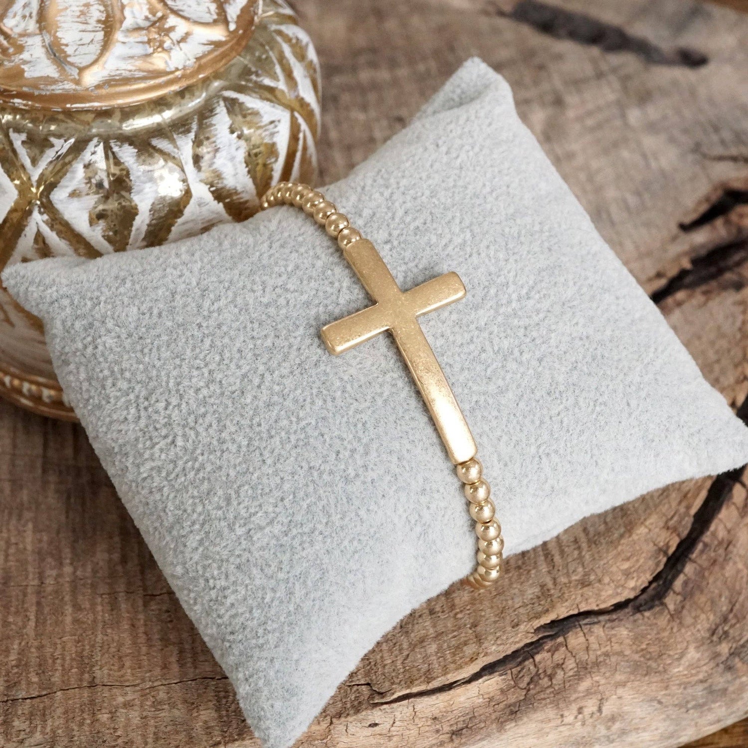 Minimal Cross Stretchy Bracelet – Worn Gold Tone