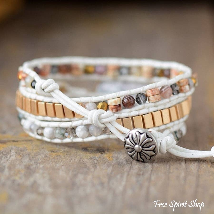 This beautiful beaded wrap bracelet is handmade with natural White Howlite stone and assorted beads. It is mounted on genuine white coated leather.