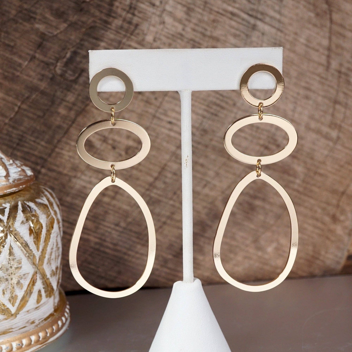 Sleek yet bold, these abstract hoop earrings bring an artful touch to any look. Three fluid, pebble-like hoops cascade effortlessly, catching the light with a glossy gold-tone finish. Lightweight and airy, they make a statement without the weight—perfect for everyday wear or elevating an evening ensemble.
